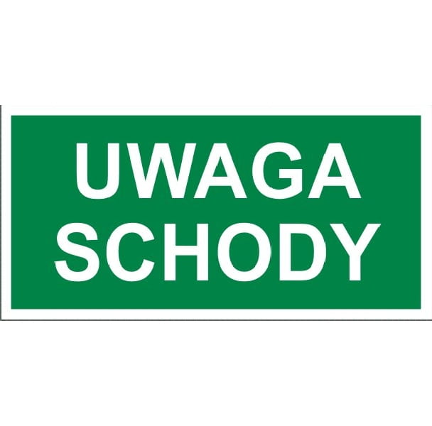 Tabliczka informacyjna Uwaga schody to uzupelniajacy znak ewakuacyjny, ktory ostrzega przed zmiana poziomu i obecnoscia schodow w budynku. Stosowany w ciagach komunikacyjnych, przy klatkach schodowych oraz wszedzie tam, gdzie istnieje ryzyko potknięcia lub upadku.