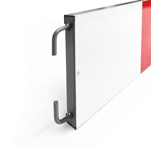 Zapora U-20a wykonana jest z blachy stalowej ocynkowanej o grubosci 1,25 mm, co gwarantuje wysoka odpornosc na korozje i uszkodzenia mechaniczne. Powierzchnia wyklejona jest na przemian biala i czerwona folia odblaskowa I generacji z certyfikatem CE i widocznym znakiem wodnym. Zakonczenia zapory sa dodatkowo wzmocnione profilami stalowymi, co znacznie wydluza zywotnosc produktu nawet przy intensywnym uzyciu w trudnych warunkach terenowych.