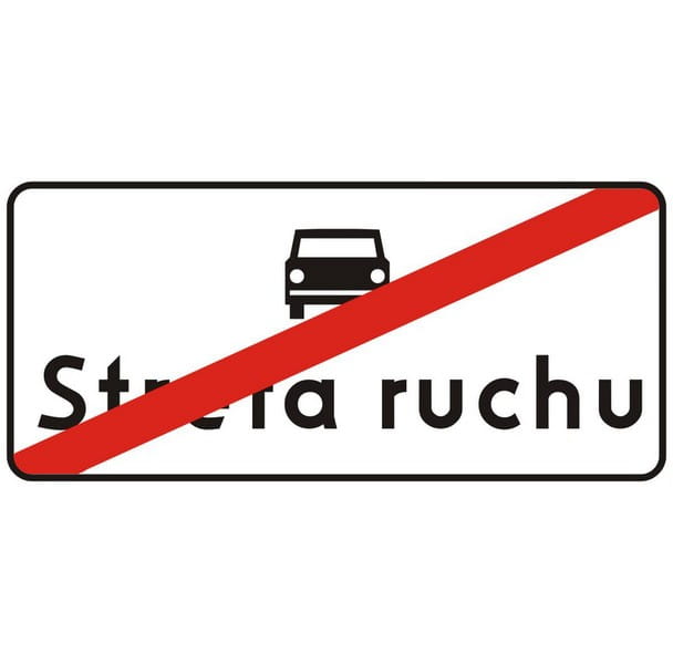 Znak D-53 - Koniec strefy ruchu w rozmiarze duzym 900x420mm to profesjonalny znak drogowy informacyjny stosowany do oznaczenia wyjazdu ze strefy ruchu. Umieszcza sie go na wszystkich drogach wylotowych ze strefy oznakowanej znakami D-52, w tym samym przekroju poprzecznym drogi. Znak moze byc rowniez montowany po lewej stronie jezdni, na odwrotnej stronie znaku D-52.